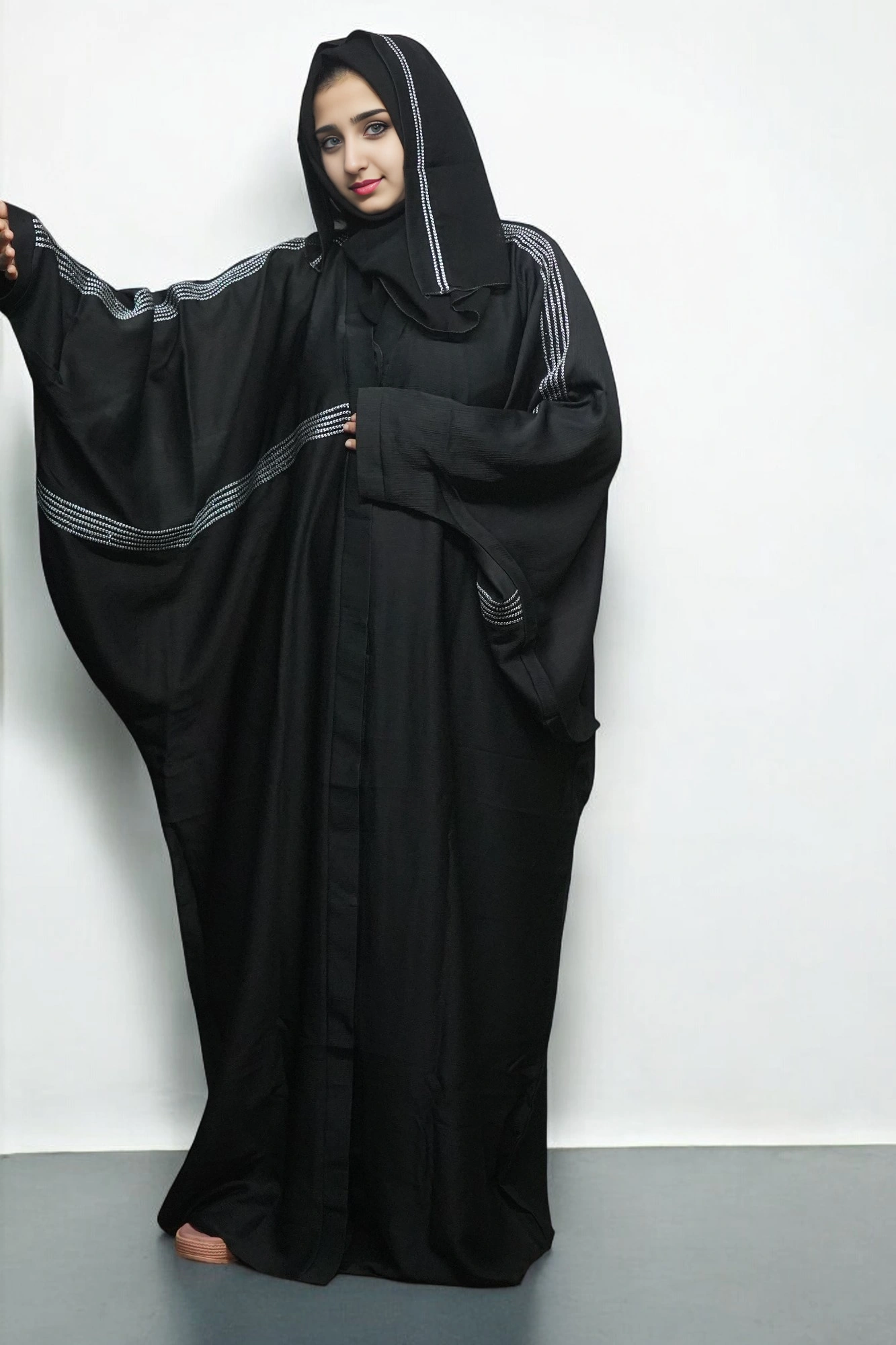 Choose our Silver Latkan Front Open Burqa in Black and experience the perfect blend of luxury, modesty, and style.”