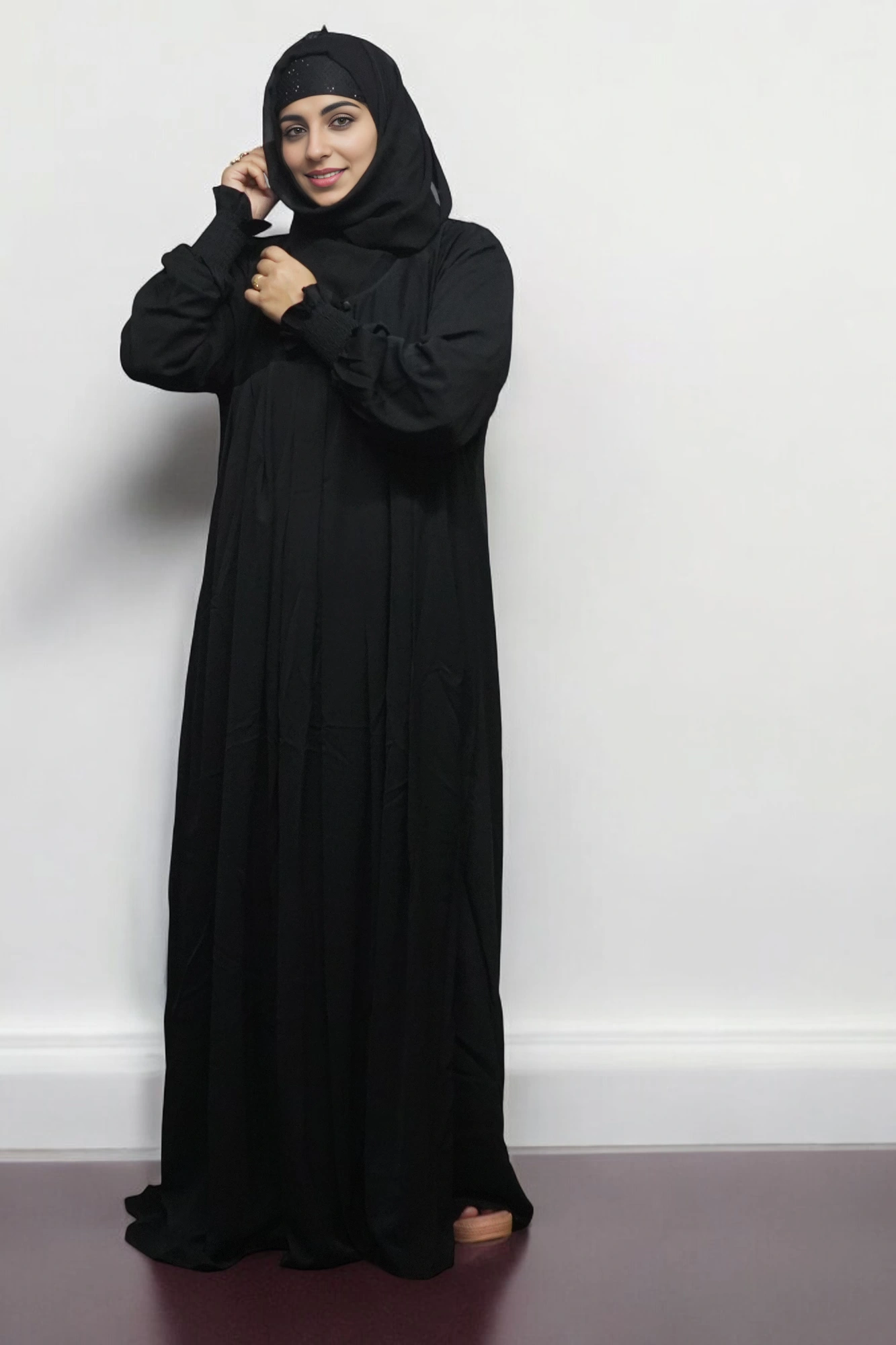 The Burkha Classic Umbrella in Black combines classic elegance with contemporary design, making it a timeless addition to any modest wardrobe. Featuring a stylish button-down front and a unique umbrella-style silhouette, this burkha offers a flattering fit that enhances comfort and mobility while maintaining modesty. The generous umbrella cut adds a graceful flow to the garment, ensuring it drapes beautifully with every step.