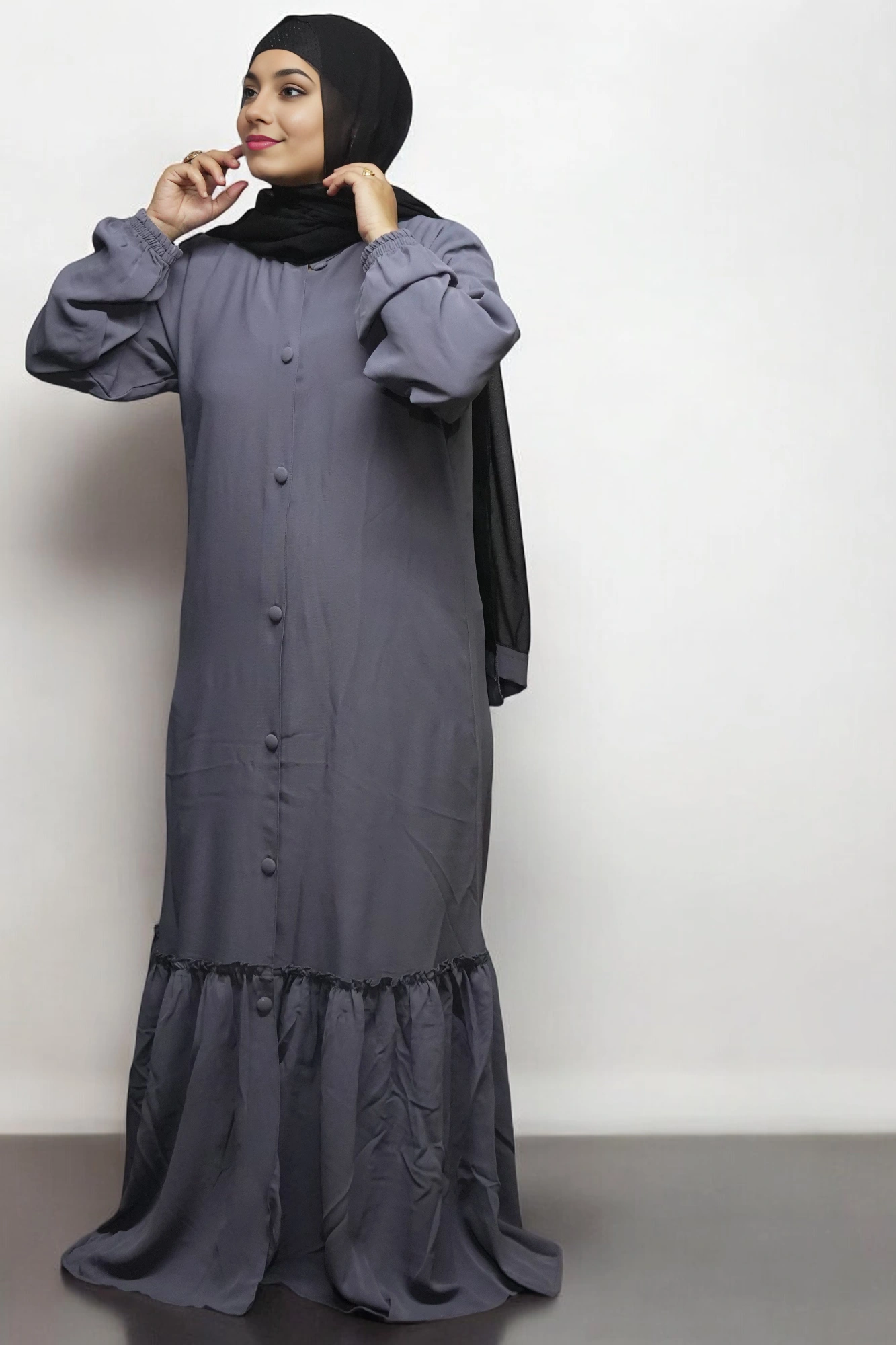 Wrap yourself in the serene elegance of our Burkha FULL BUTTON CHUN BOTTOM in GRAY-STONE, a harmonious blend of color, design, and affordability. The soothing gray-stone hue has a calming effect on the senses, evoking feelings of balance, stability, and composure. This versatile color is perfect for everyday wear, as it exudes a sense of sophistication and refinement.