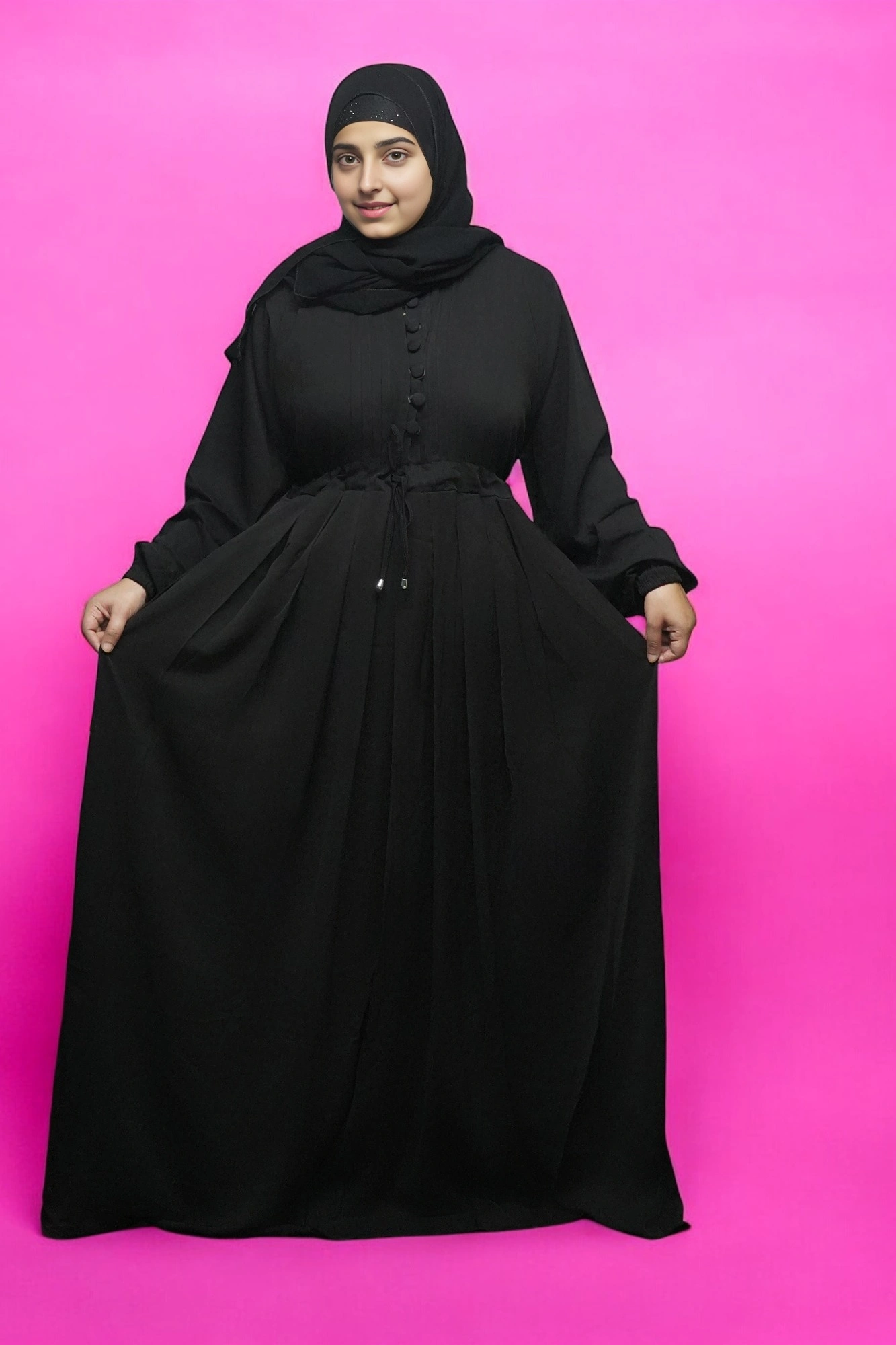 Our Burkha FULL BUTTONS OPEN in Pink is a masterfully crafted garment that combines style, comfort, and affordability. The soft pink hue has a profound effect on the wearer’s mood, evoking feelings of joy, creativity, and confidence. The relaxed fit and flowy design make it perfect for everyday wear, while the full buttons and open style add a touch of elegance and sophistication.
