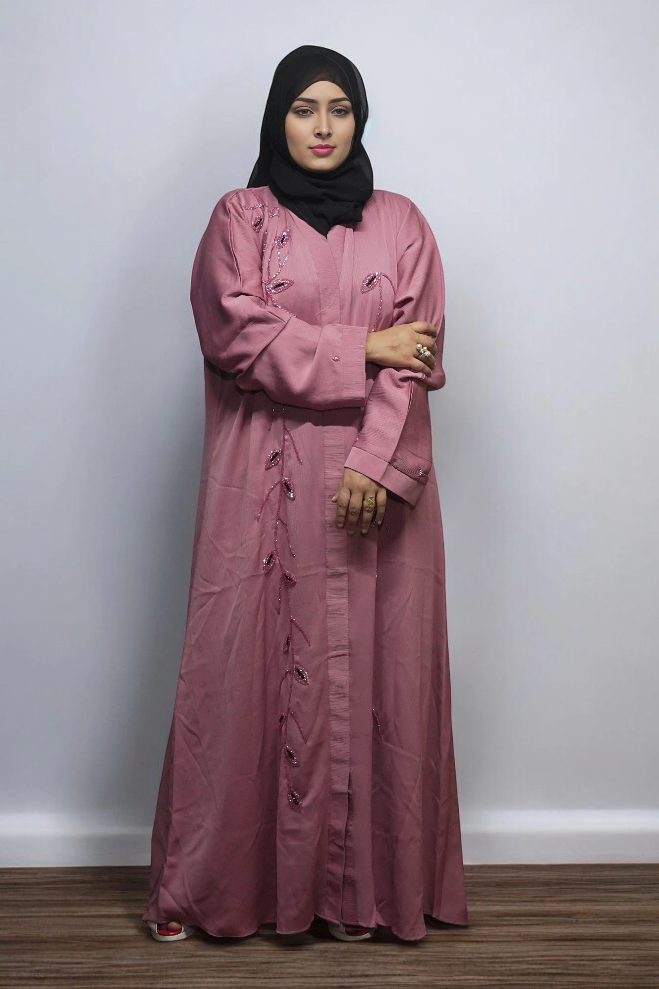 Add a pop of color and glamour to your wardrobe with our Crystal Hand Work Premium Burqa in Fandango Pink. This stunning burqa features: