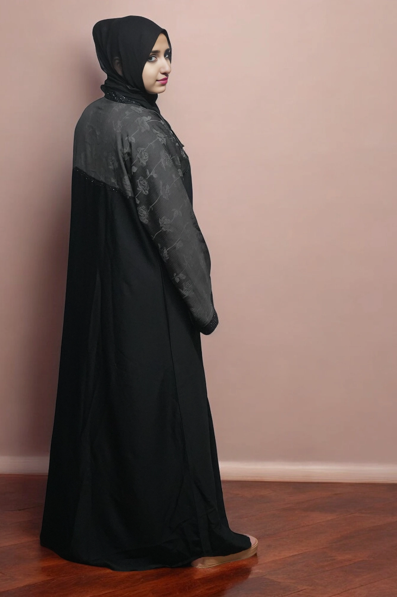 Experience the perfect blend of modernity and tradition with our High-Quality Multi-Colored Burqa with Front Strip, Edge Sleeves, and Black Stones in Black-Carbon-Gray. This stunning burqa features:
