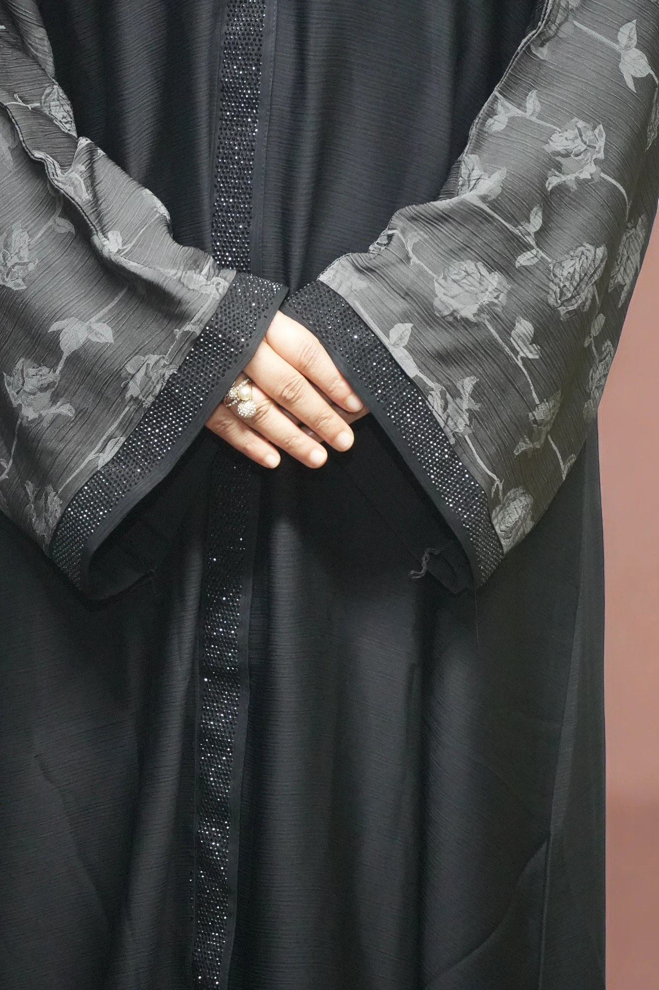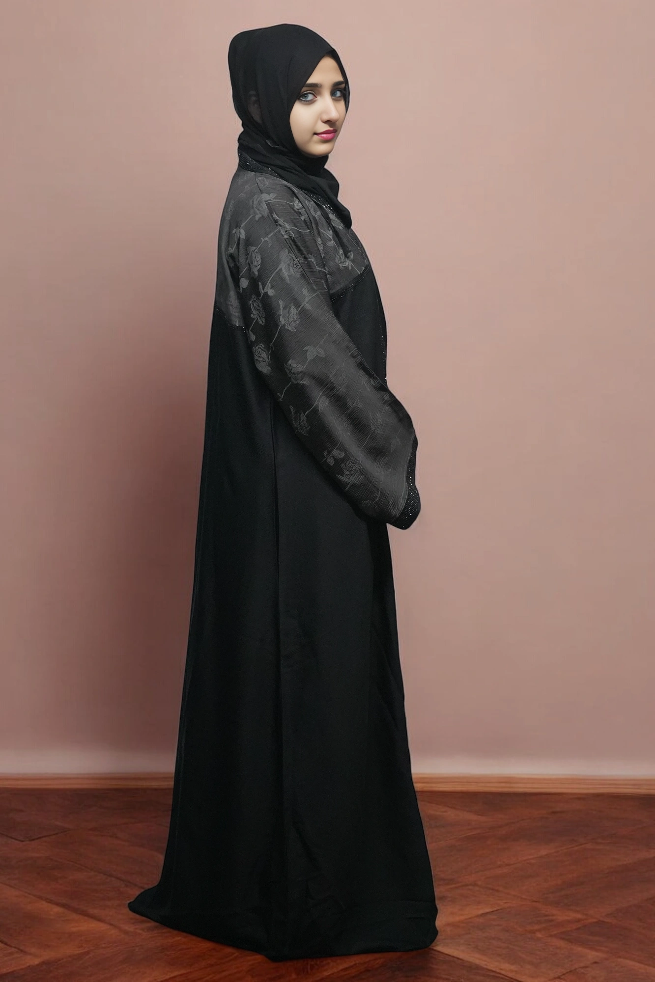 “Elegant Mystique: Black Stone Latkan Flower Burqa in Black!