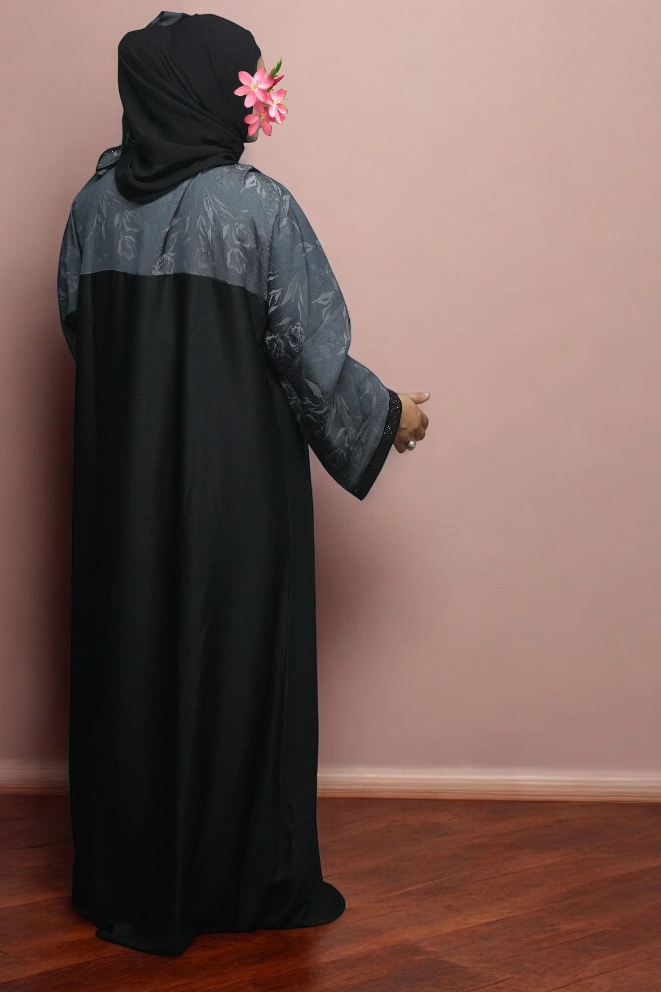 Treat yourself to the sweetness of our Flower Textured Burkha in Pastel Pink. Order now and bloom into style!”