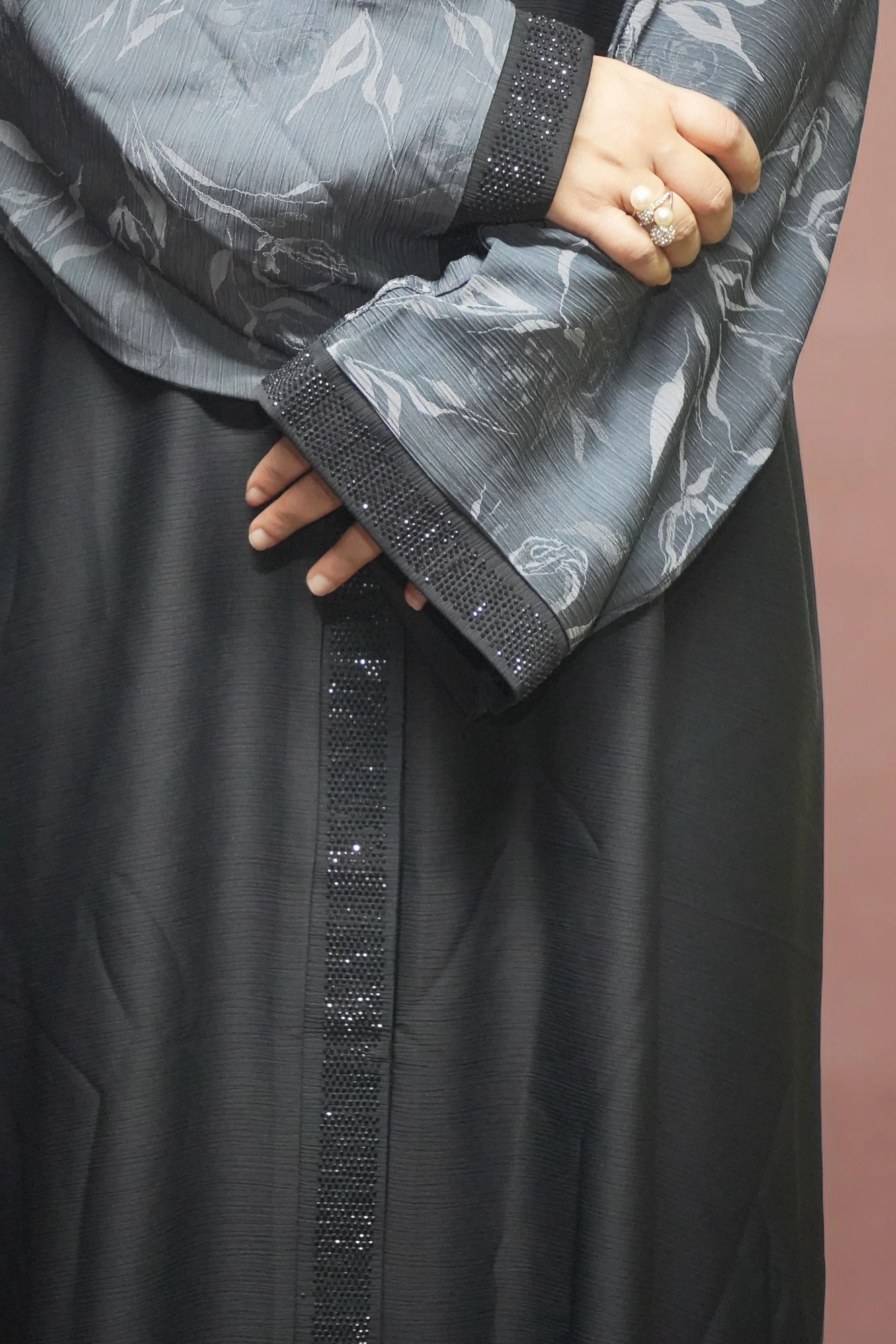 “Timeless Elegance: High-Quality Multi-Colored Burqa with Front Strip, Edge Sleeves, and Black Stones in Black-Gray
