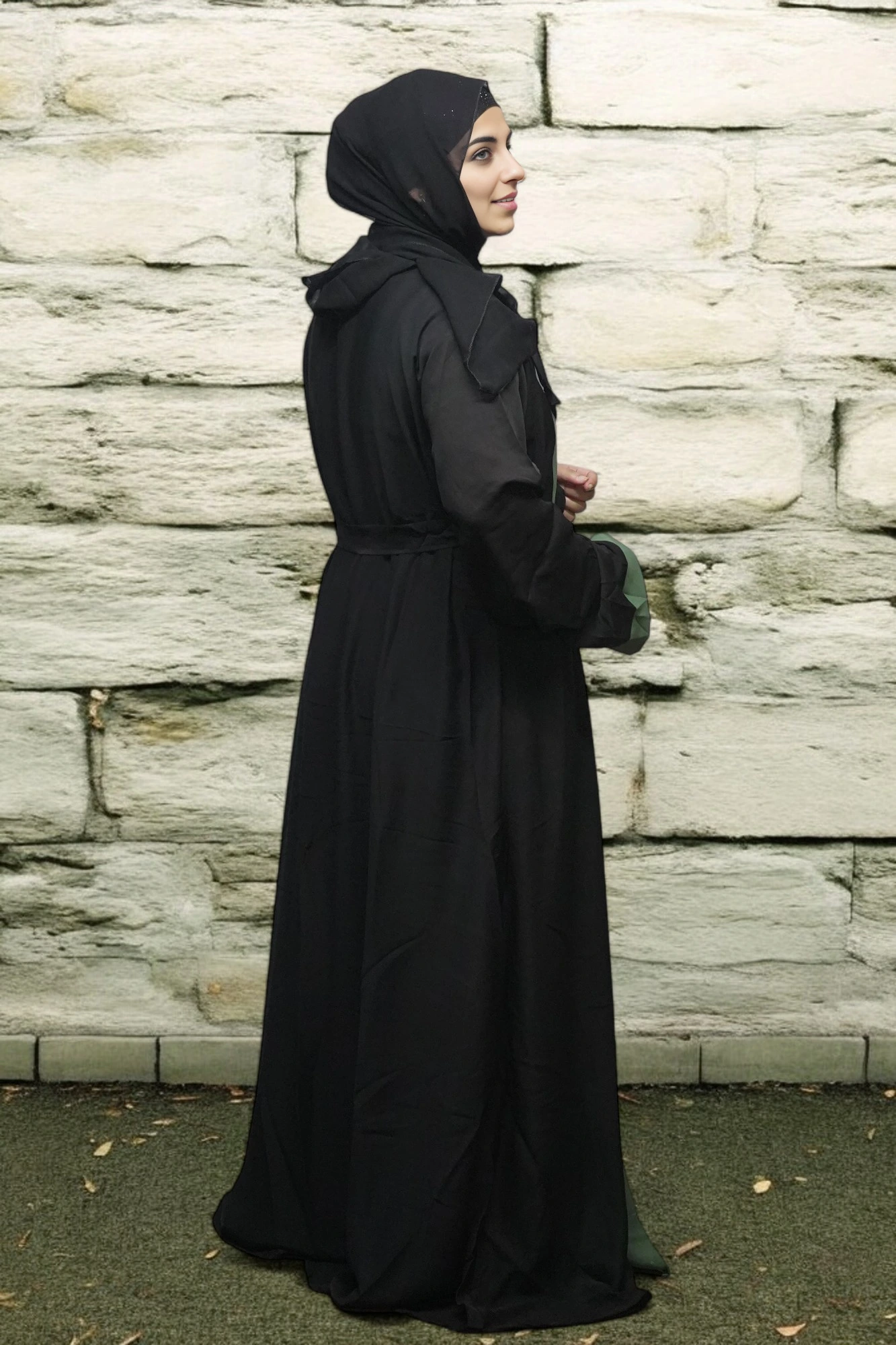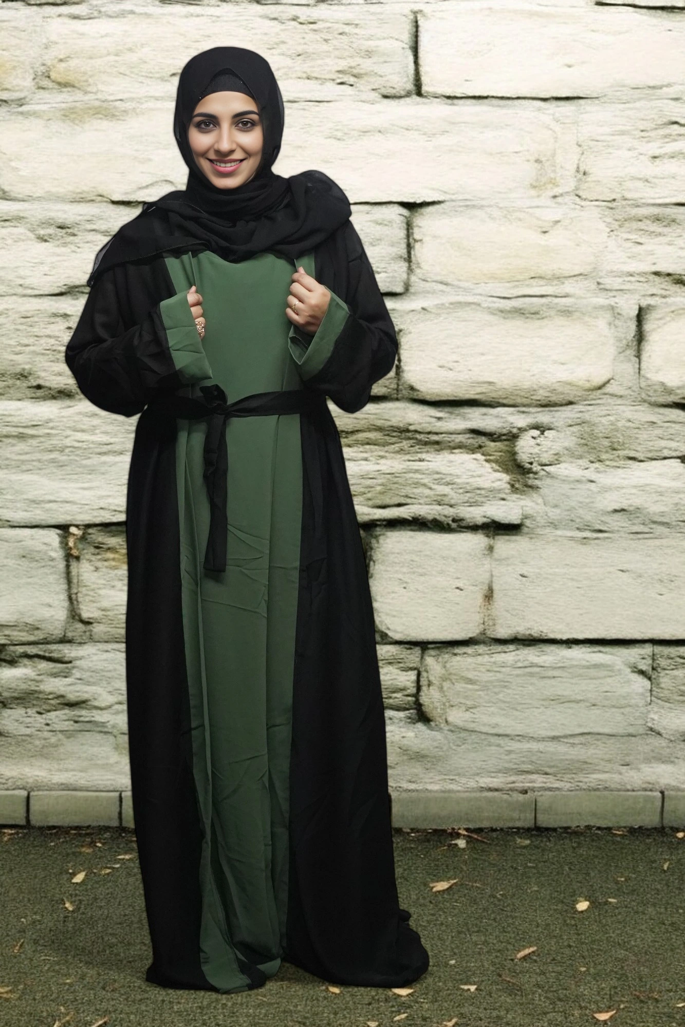 Choose our Open Front Burqa With Belt in Bottle Green and experience the perfect blend of style, comfort, and sophistication.”