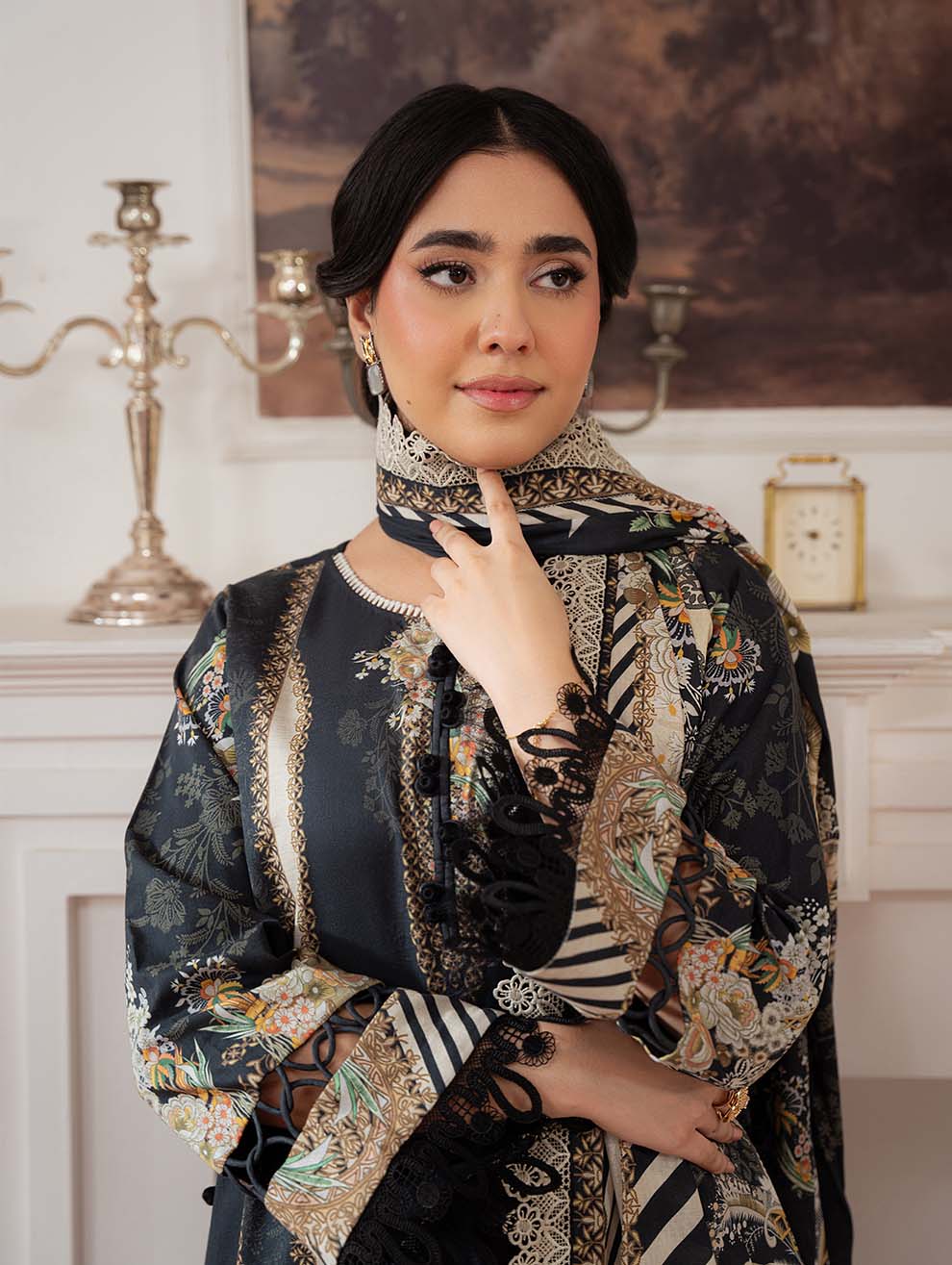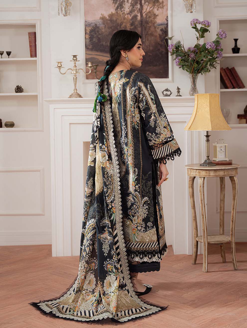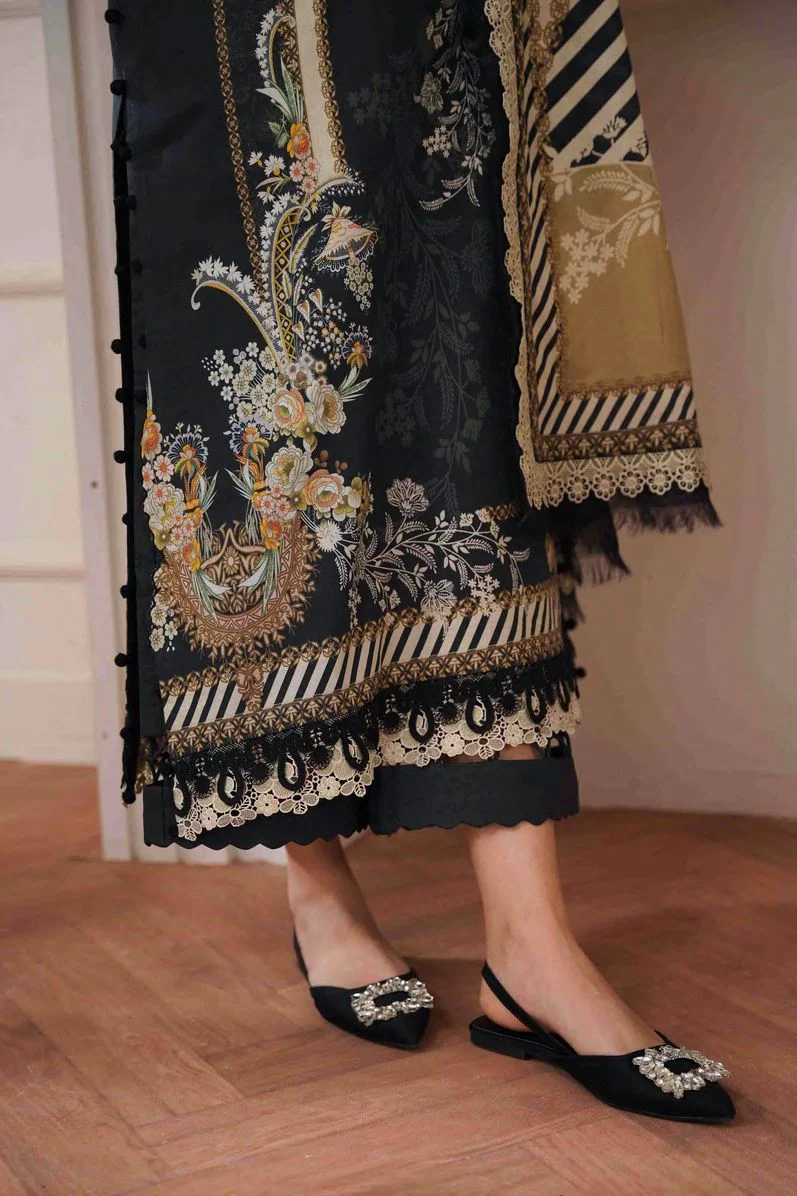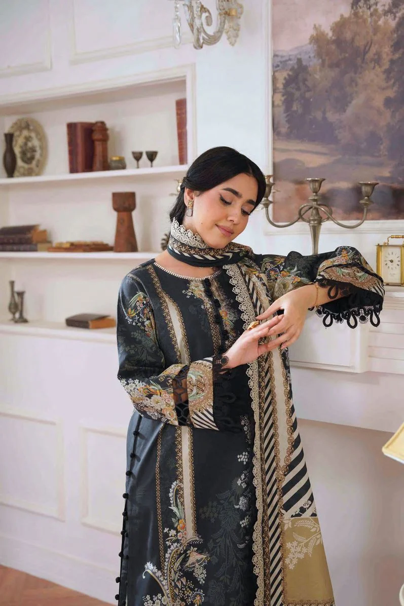 Classic Pakistani cotton dress material in a deep black shade featuring elegant embroidery and traditional printed patterns. Designed in breathable pure cotton with a vibrant chiffon dupatta for timeless ethnic style.