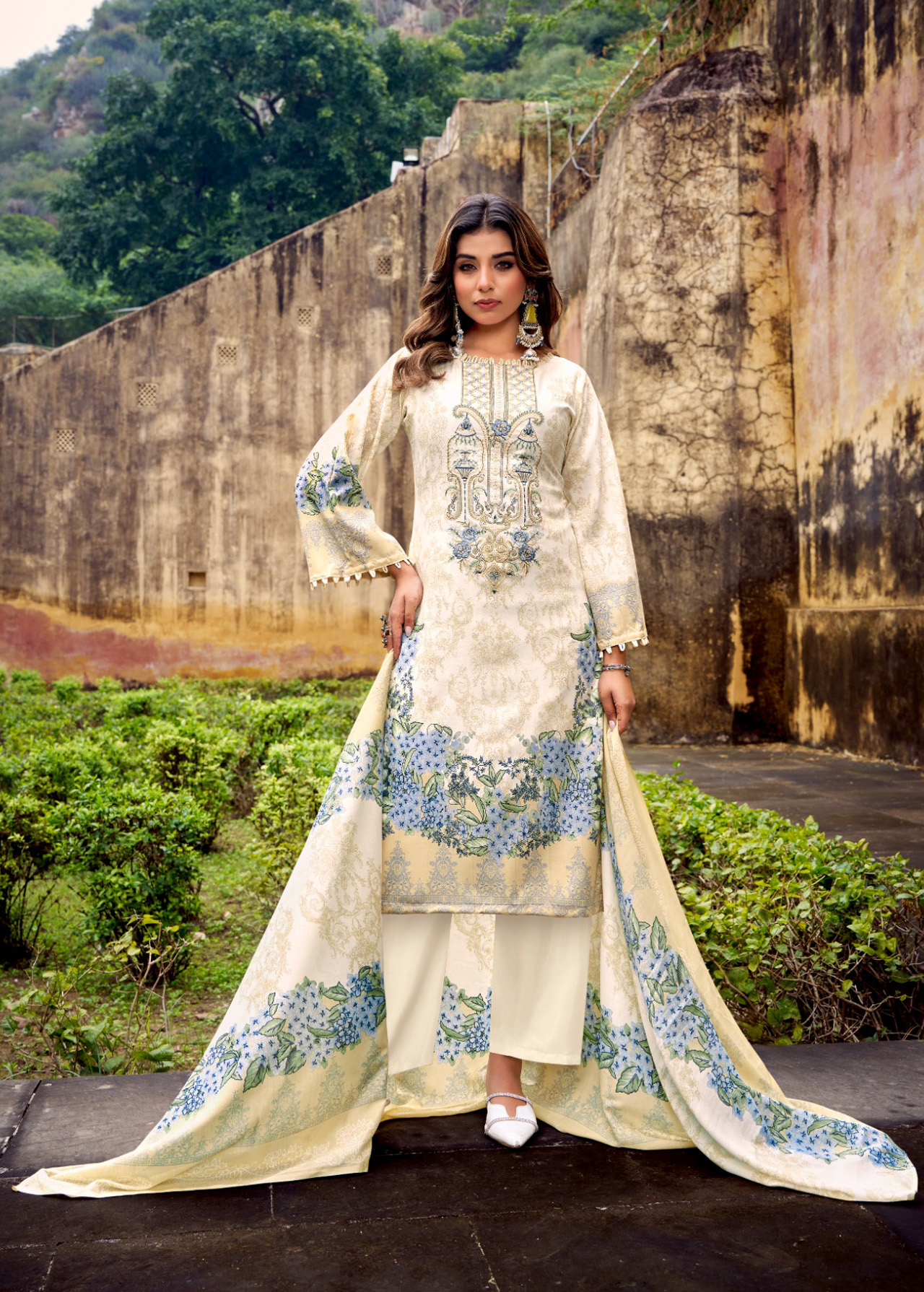 Beautiful Pakistani cotton dress material featuring a soft cream base with vibrant floral prints and detailed embroidery styling. A graceful unstitched salwar kameez set perfect for festive and ethnic occasions.