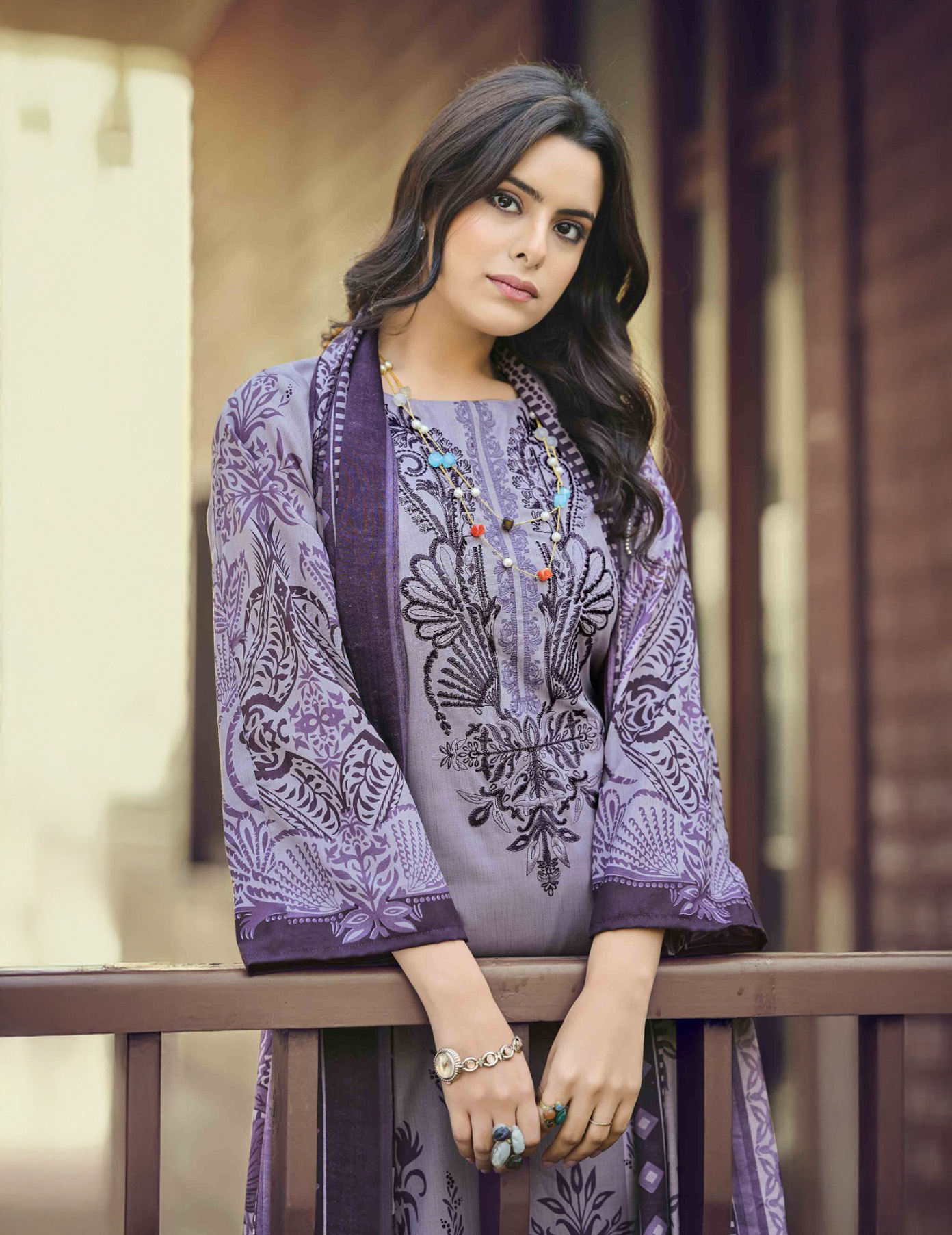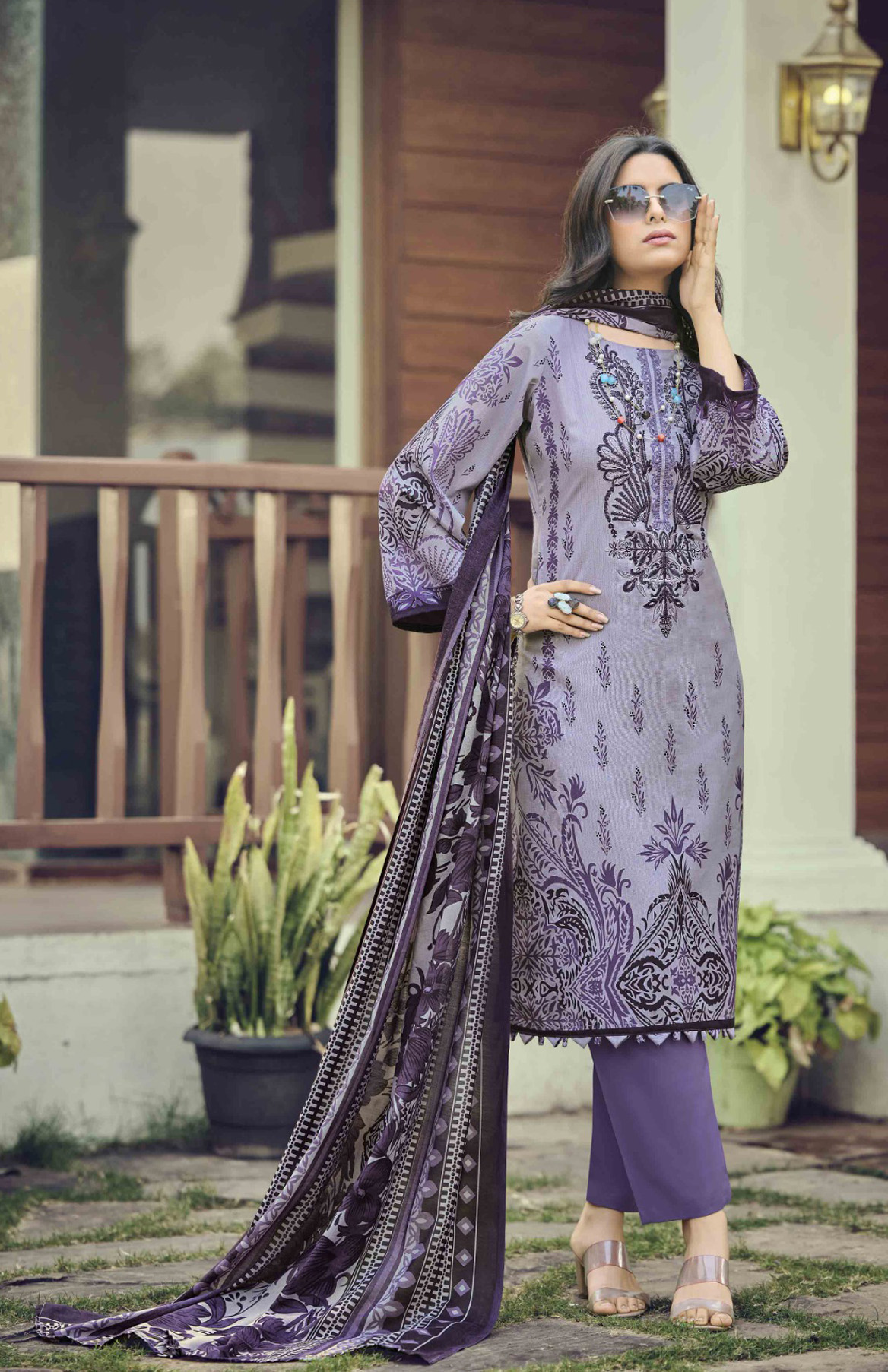Graceful Pakistani cotton dress material in Mauve Purple featuring delicate embroidery and beautiful printed cotton fabric that creates an elegant unstitched salwar kameez design.