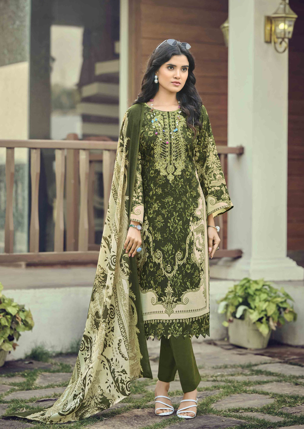 Rich Pakistani cotton dress material in Olive Green featuring intricate embroidery and elegant printed cotton motifs that create a beautiful ethnic salwar kameez outfit.