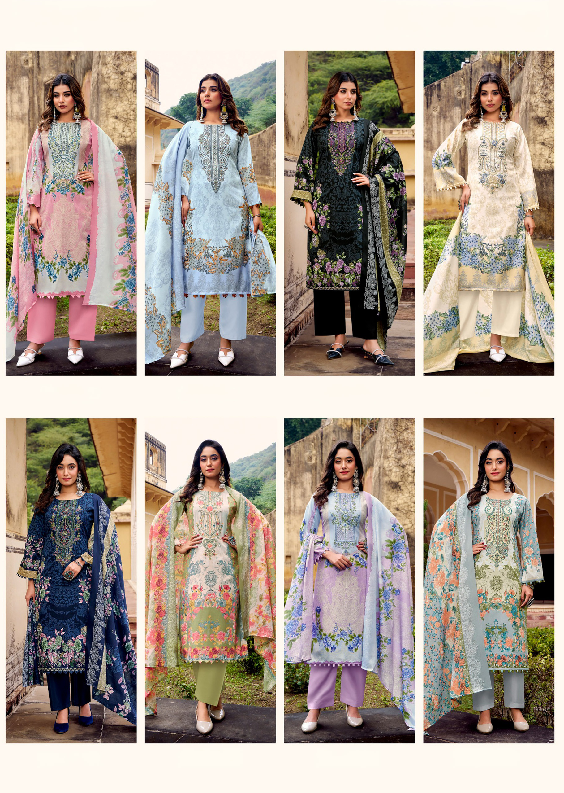 Designed with elegant Pakistani floral prints and delicate embroidery, this cambric cotton suit dress material offers a timeless ethnic style. The breathable cotton fabric makes it comfortable for long wear while maintaining a premium traditional look.