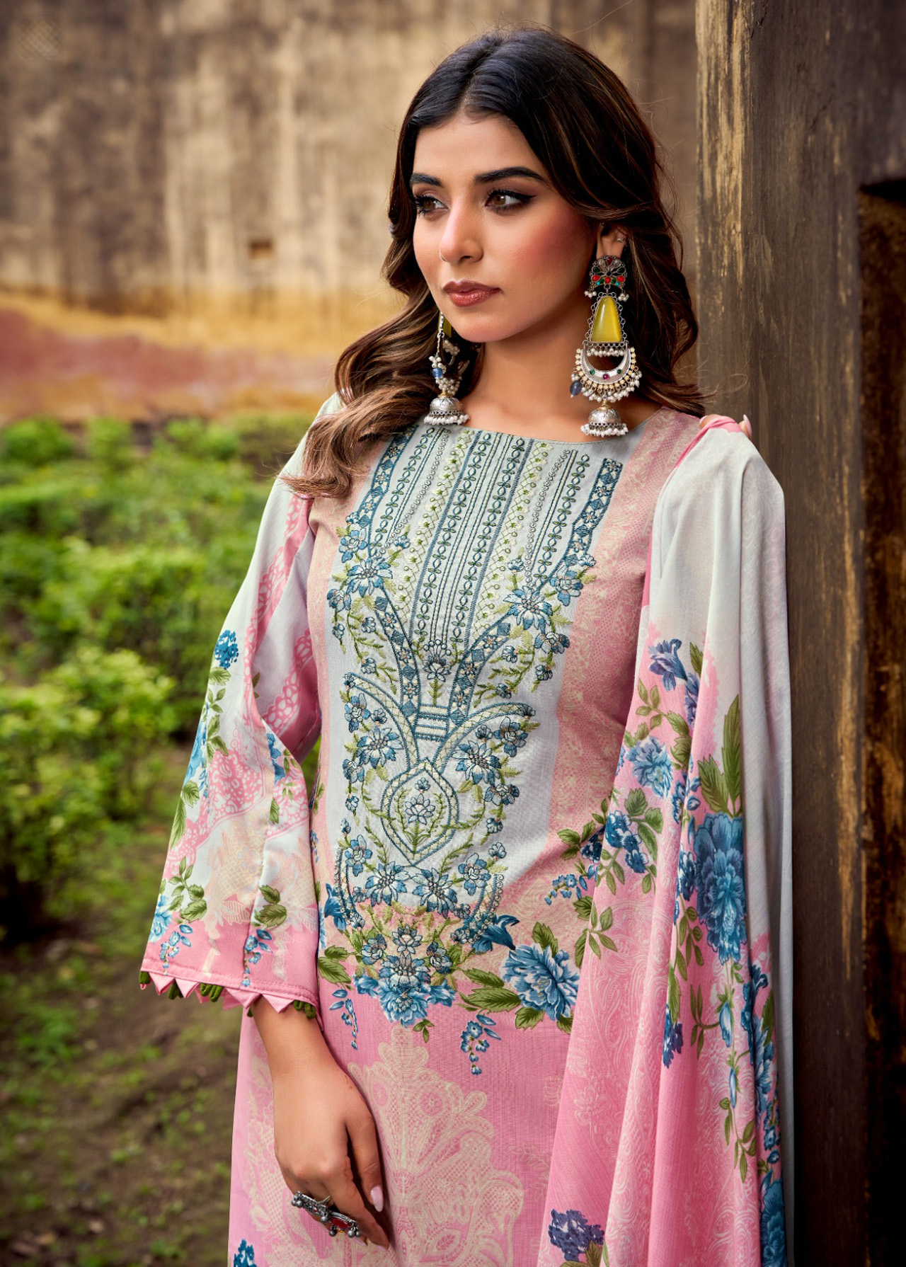 This beautiful Pakistani suit dress material features charming ethnic prints crafted on premium cambric cotton fabric with elegant embroidery detailing. The lightweight cotton construction ensures a comfortable and breathable outfit for everyday ethnic styling.