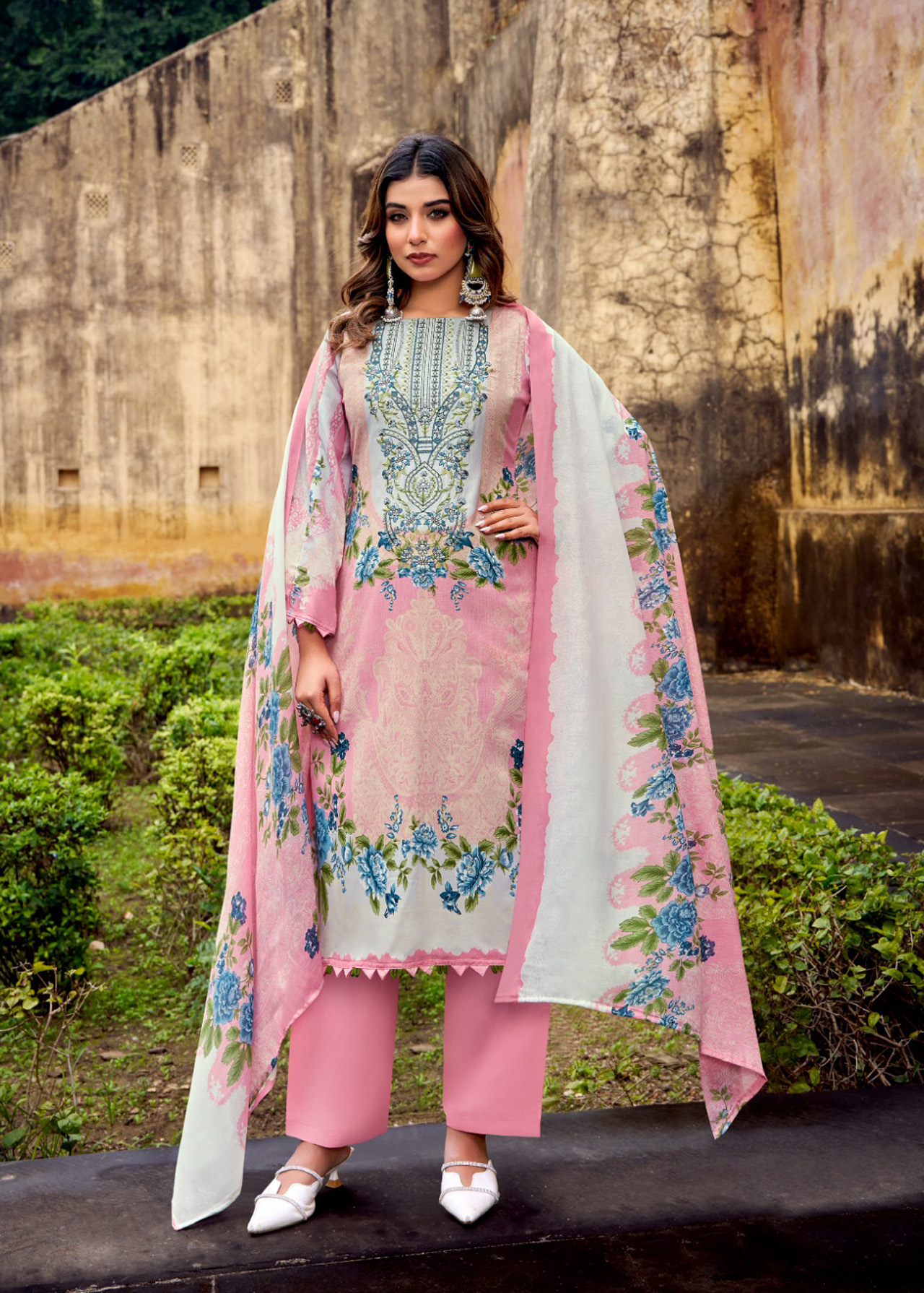 Beautiful pink Pakistani cotton suit featuring floral digital prints with detailed embroidery on the neckline and front panel. The soft pastel tone adds a charming feminine touch to this elegant ethnic outfit.