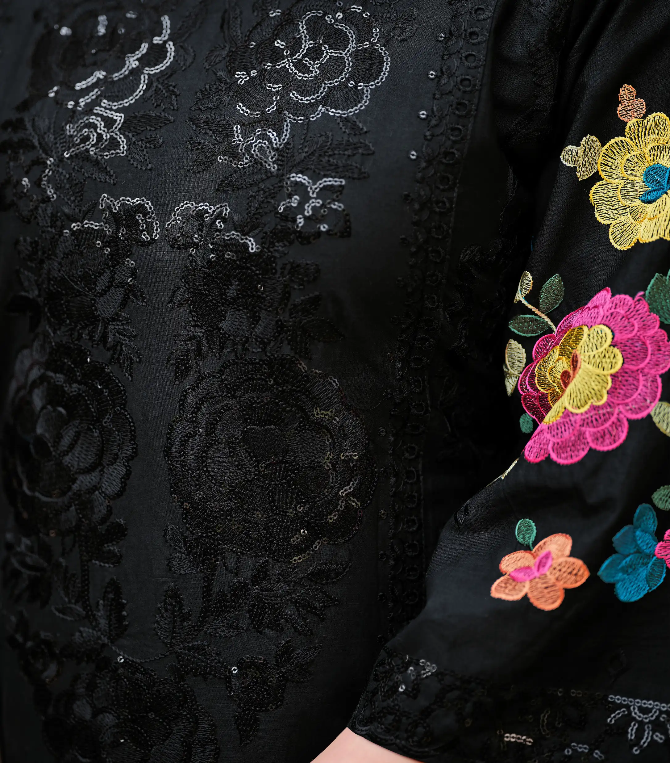 Black carries a timeless elegance that never needs an introduction. This unstitched Pakistani pure cotton lawn suit in classic black features full heavy Karachi embroidery with detailed sleeve work — a striking combination that feels both modern and deeply rooted in tradition.