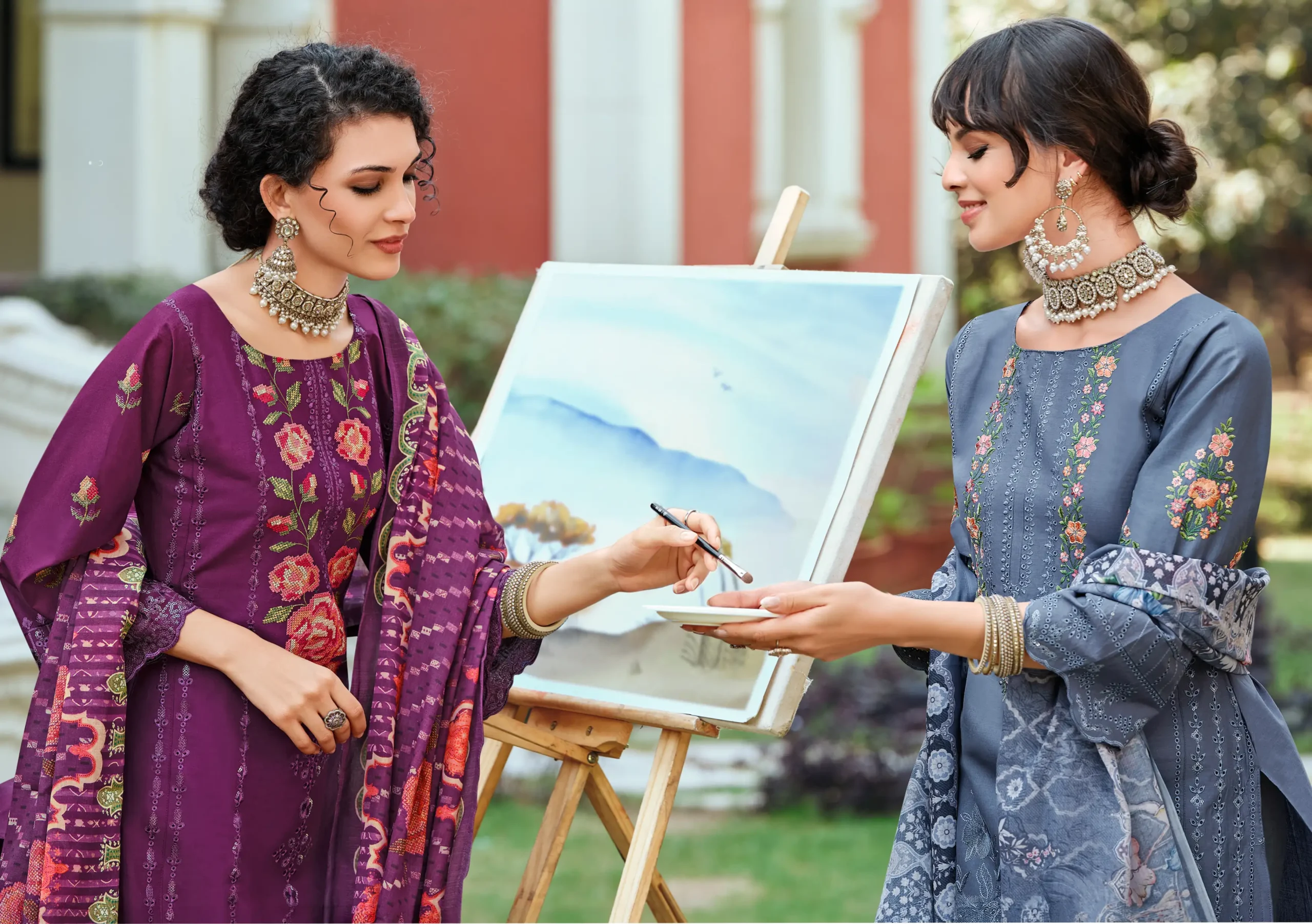 Purple has always been the color of celebration — rich, warm, and impossible to ignore. This unstitched Pakistani pure cotton lawn suit in deep purple features heavy Karachi embroidery with floral sleeve detailing and a coordinated mal mal dupatta that adds to its festive charm.