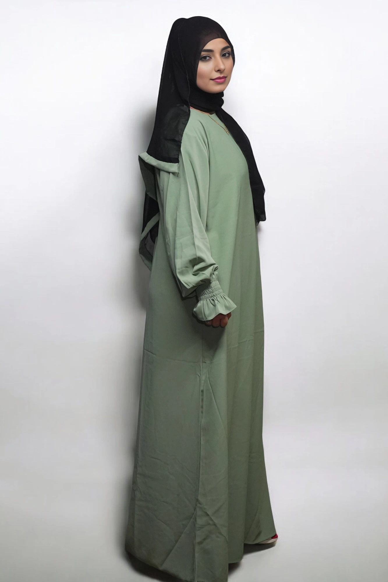 The sleeves are designed to provide ease of movement, while the fabric is soft and gentle against your skin. With its affordable price point, this burkha is an excellent addition to any wardrobe. Embrace the perfect blend of style, comfort, and value with our Simple Burkha Chun Sleeves in Lite Olive.”